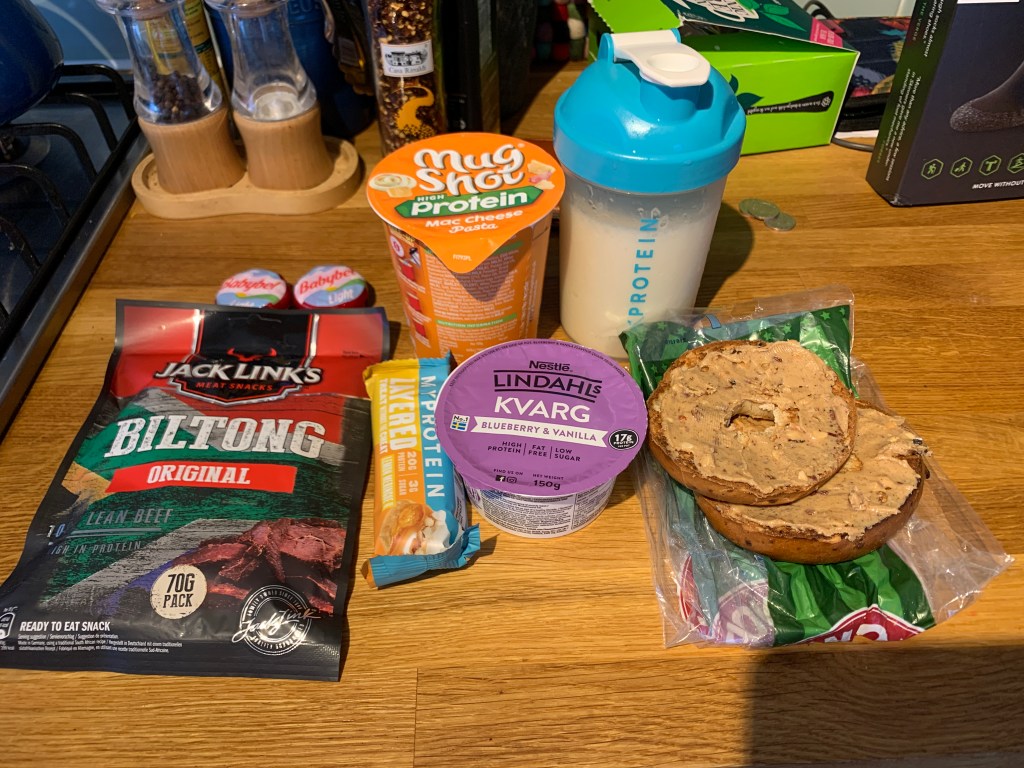 Every week I’m in a different city working on a different live TV event, lots of travelling, lots of hotel rooms, service station stops and catering provided. It’s taken me about a year to really work out how I’m going to maintain my nutrition when I’m away, with no fridge or kitchen I have to rely on ready to eat, grab-able stuff with not much prep time. It’s not optimal, but I’ve found a number of products which I now rely on to hit my protein and calories goals. I just make sure that any fresh food I buy when I’m away is fruit or veggies I can eat raw, and concentrate on eating loads of veg when I’m home. All diets have an element of making the best of a situation, I rarely chose to go out to eat with colleagues when I’m away and hit the gym instead of the pub, as I’d rather save my calories for alcohol and calorie dense foods when I’m at home.